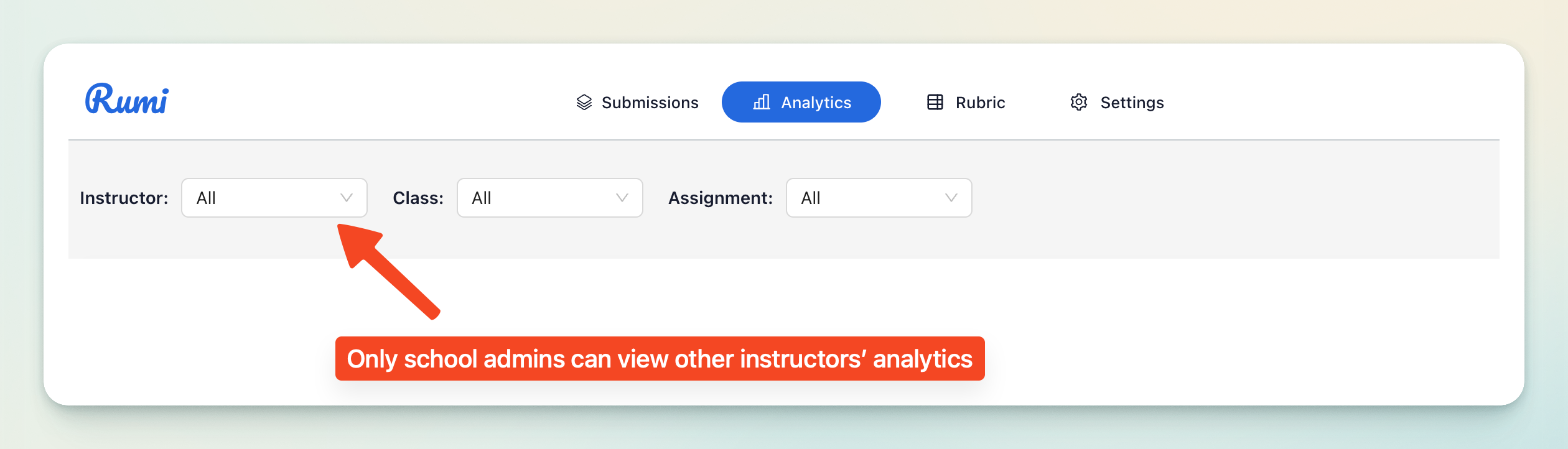 Rumi’s Analytics Dashboard gives instructors and administrators powerful tools to see how Rumi and AI are being used across classes or at the institution level. It provides insights into student engagement, assignment creation, and AI usage patterns. Instructors can track how students draft essays, which prompts are used most often, and how AI policies shape learning behaviors. Administrators gain a broader, institution-wide view that highlights adoption trends, pinpoints impactful features, and surfaces opportunities for targeted support or training.
