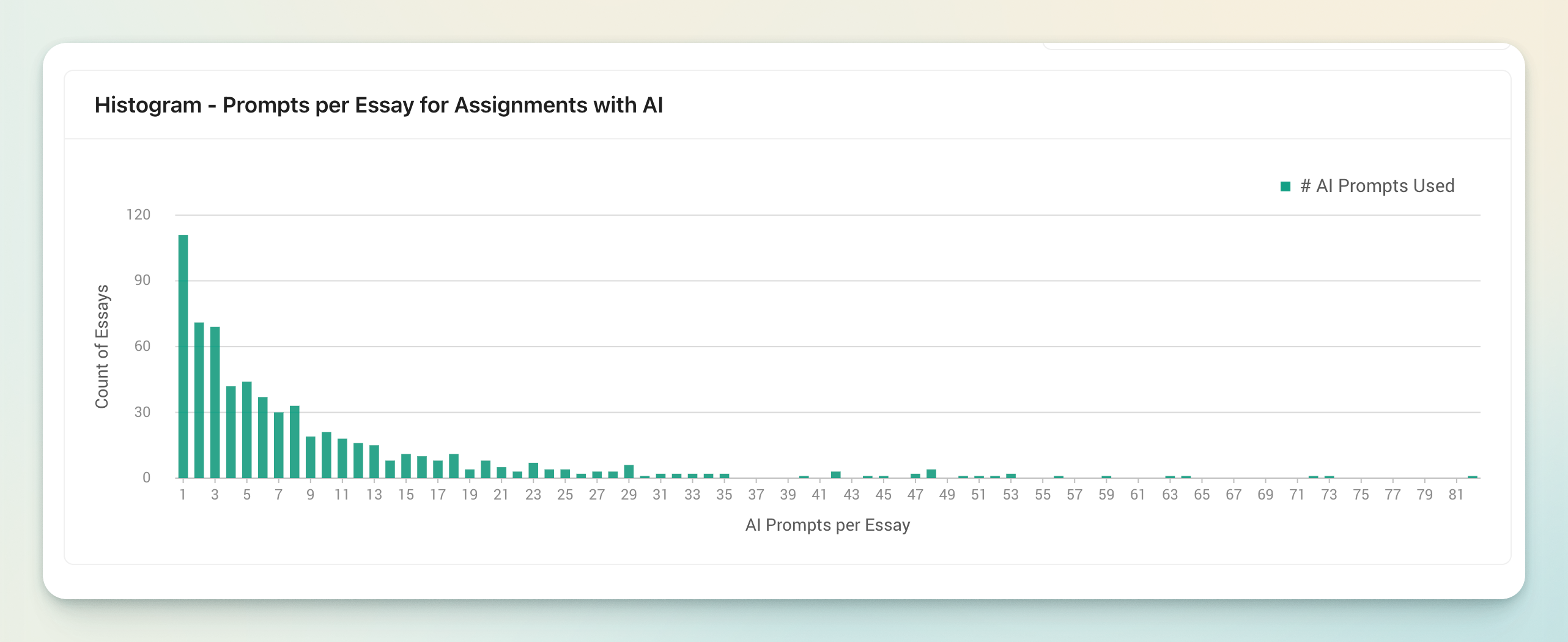 This chart illustrates the average number of prompts used per essay for assignments with AI enabled. It helps instructors see how frequently students are engaging with AI tools to improve their work.