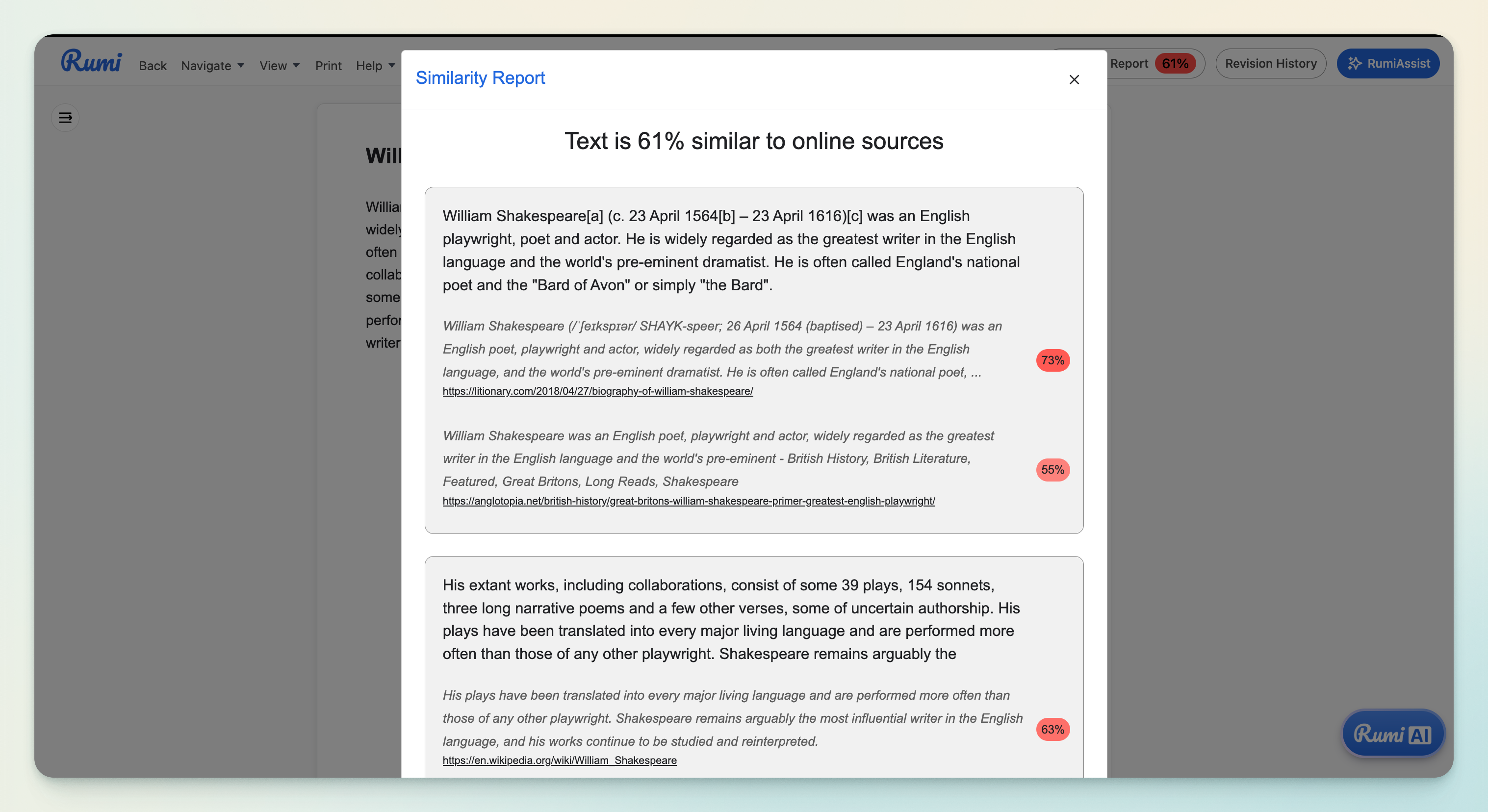 Rumi’s Similarity Report helps instructors check if portions of a student’s essay match publicly available text on the internet, such as Wikipedia or other online sources. The report includes links to potential source articles, allowing instructors to review and verify the context themselves.