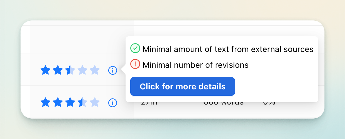 Takeaway: Context is everything. A 2.5-star rating on a rough draft assignment, where minimal revision is expected, likely represents authentic work. The same 2.5-star rating for a final essay assignment where extensive revision is the norm could be a red flag. Always compare metrics with the specific class cohort and consider the assignment type before making judgments.