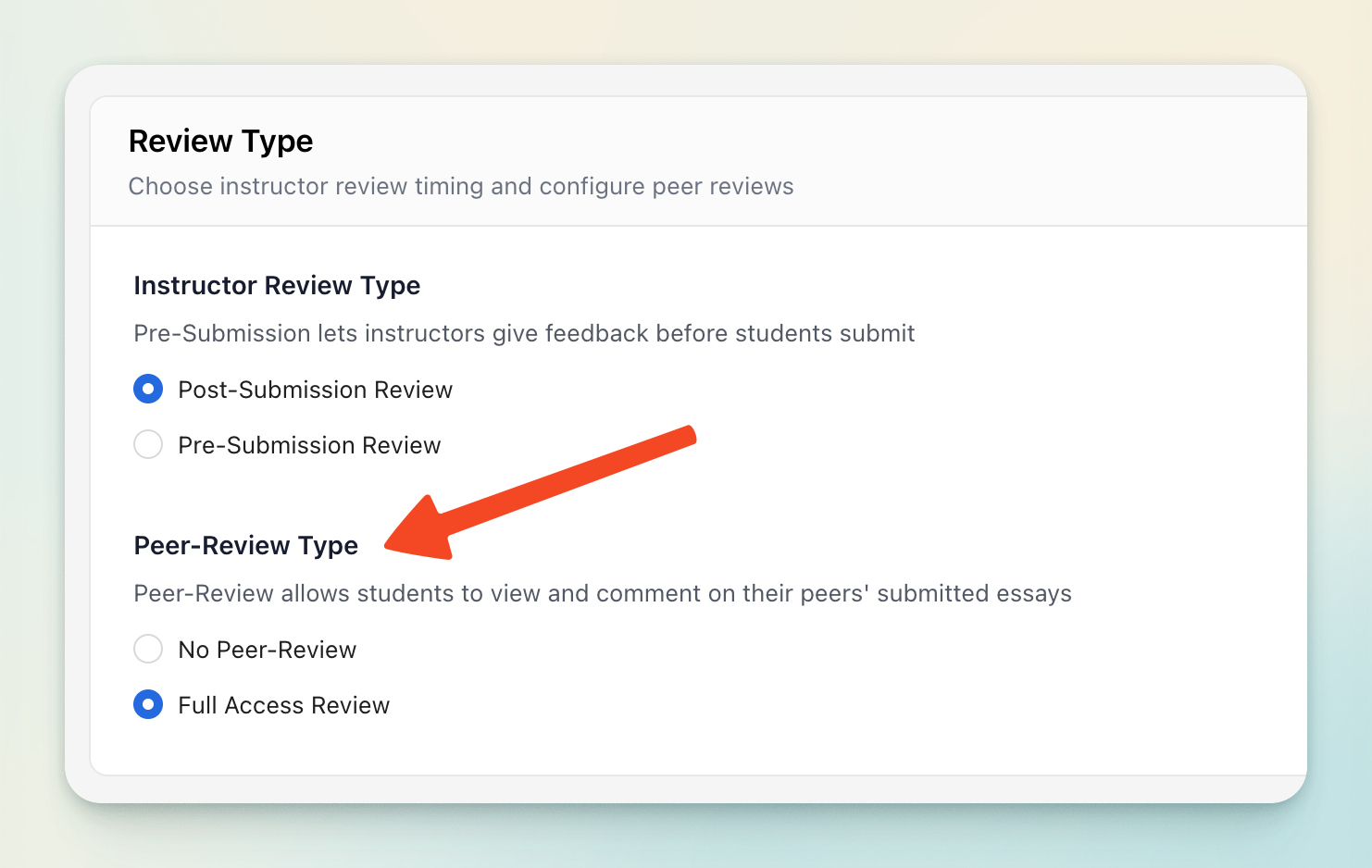 To enable peer review, instructors must select the Peer-Review option within the Rumi Dashboard when creating an assignment. This ensures the correct workflow is activated for peer-to-peer feedback.
