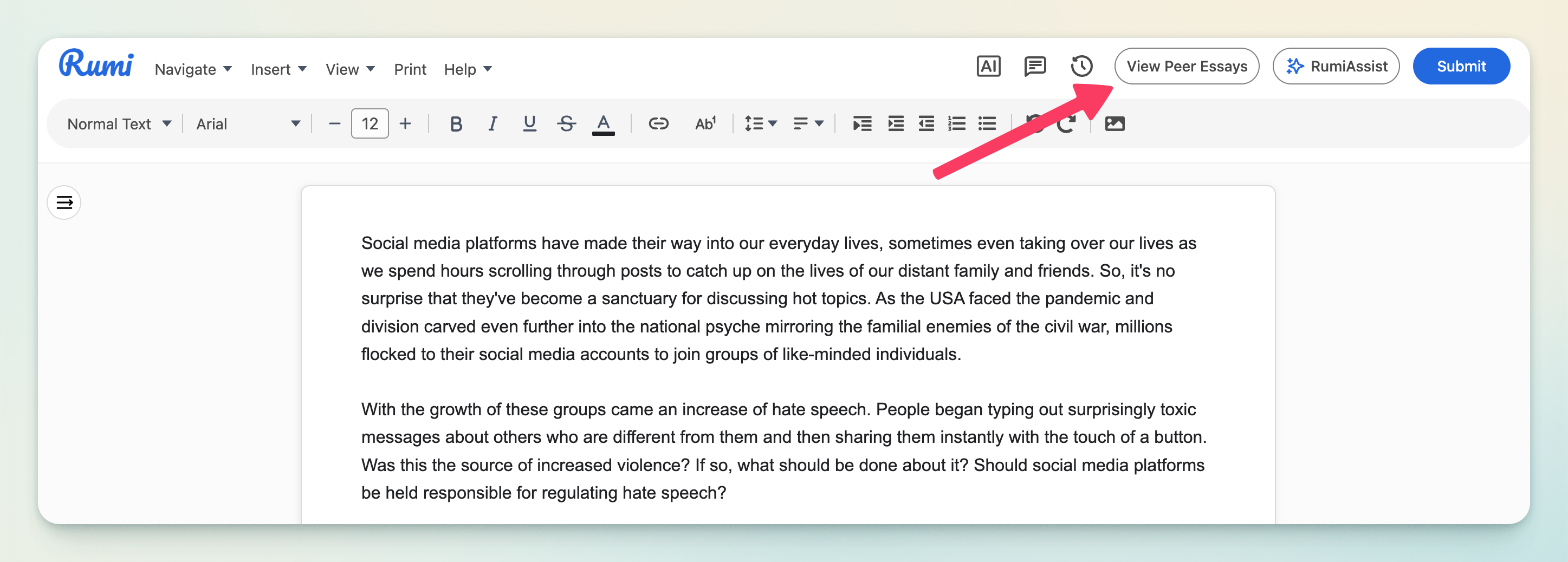 Clicking it gives them access to their assigned peer’s essay, where they can highlight sections and leave comments. The experience mirrors commenting on their own work, making the process familiar and intuitive. Within the Peer Review dashboard students can see submitted essays and the number of comments added to each essay.