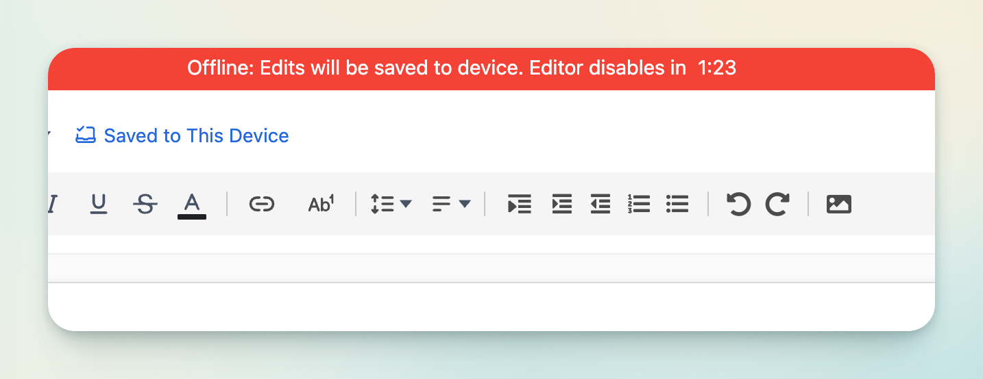 Rumi supports brief Internet disconnections of up to 1 minute and 30 seconds. After this duration, the editor is disabled and further input is prevented. Changes made during the disconnection are stored locally in the browser and automatically synchronized to the cloud once the Internet connection is restored.