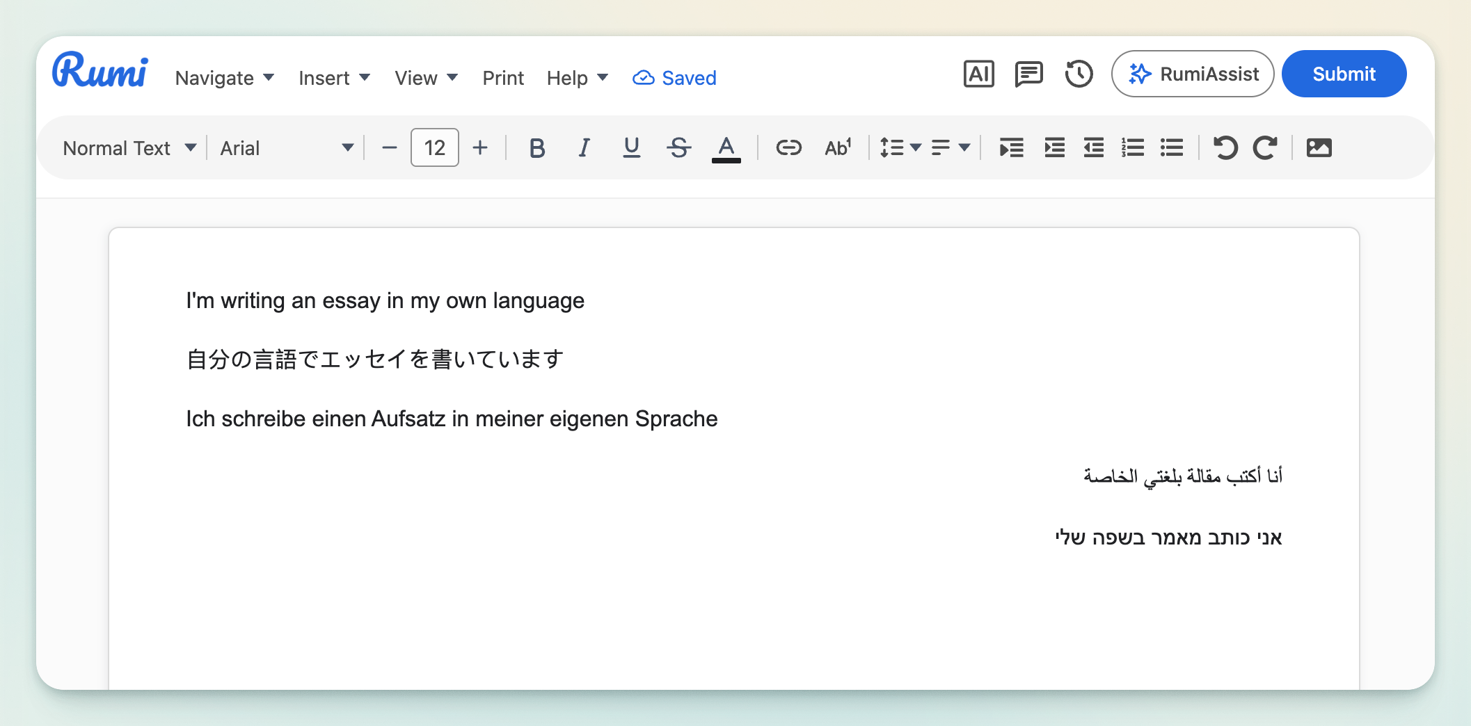 Rumi supports multilingual writing and learning. You can type in any language (including right‑to‑left scripts), translate between languages with AI, and have content read aloud in the correct voice—all inside the editor.