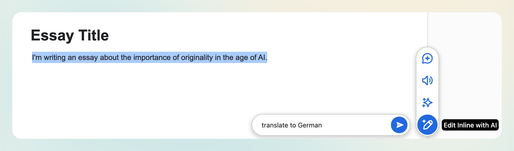 Inline AI Edits (Student‑led): Select text and type a command like “translate to German.”