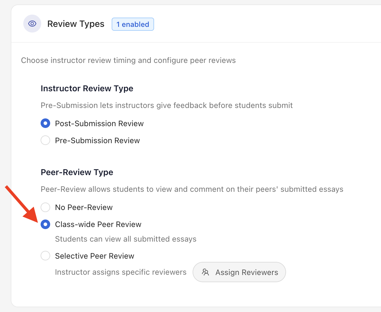 To enable class-wide peer review, select the Class-wide Peer Review option within the Rumi Dashboard when creating an assignment. This enables peer-to-peer feedback for your assignment.