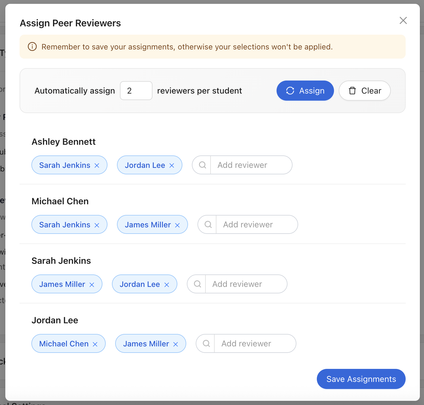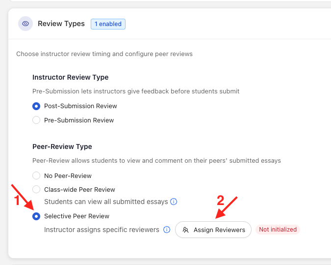 Selective Peer Review – Instructors have full control over who reviews whom, with the option to automatically or manually assign or adjust reviewer pairings.