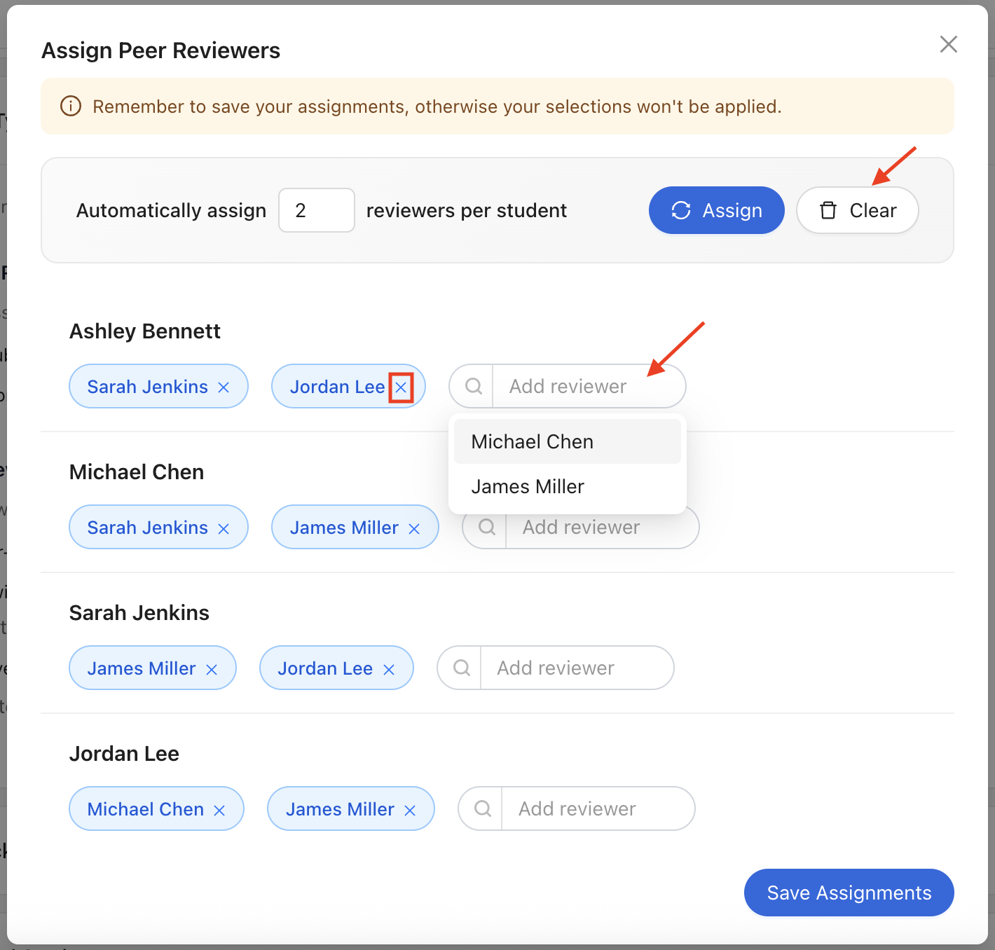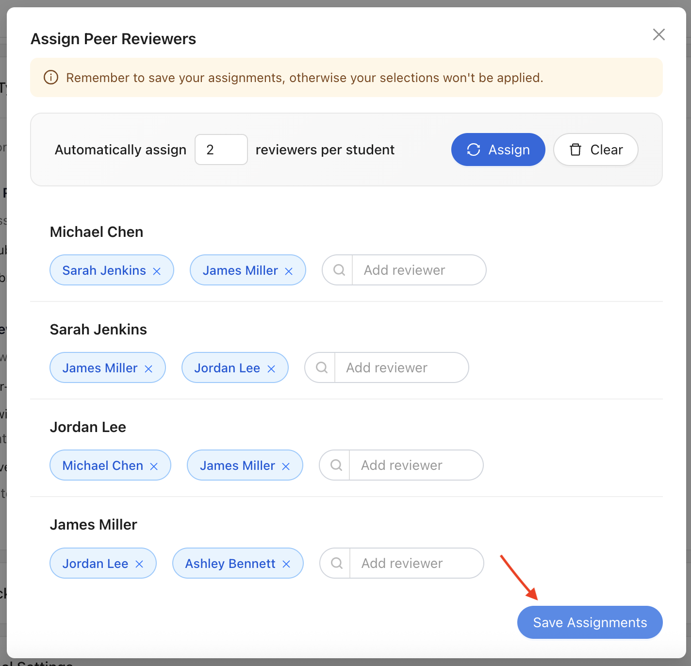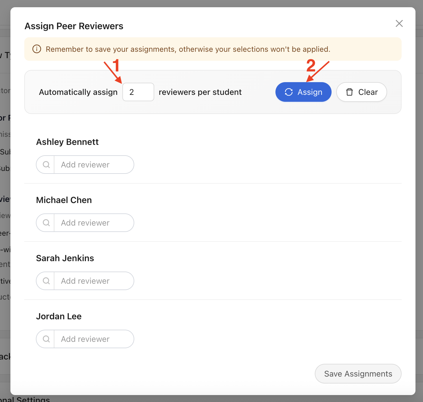 Step 2. To automatically assign reviewers, select the number of peer reviewers you want per student and click Assign. The system will randomly assign peer reviewers to each student.