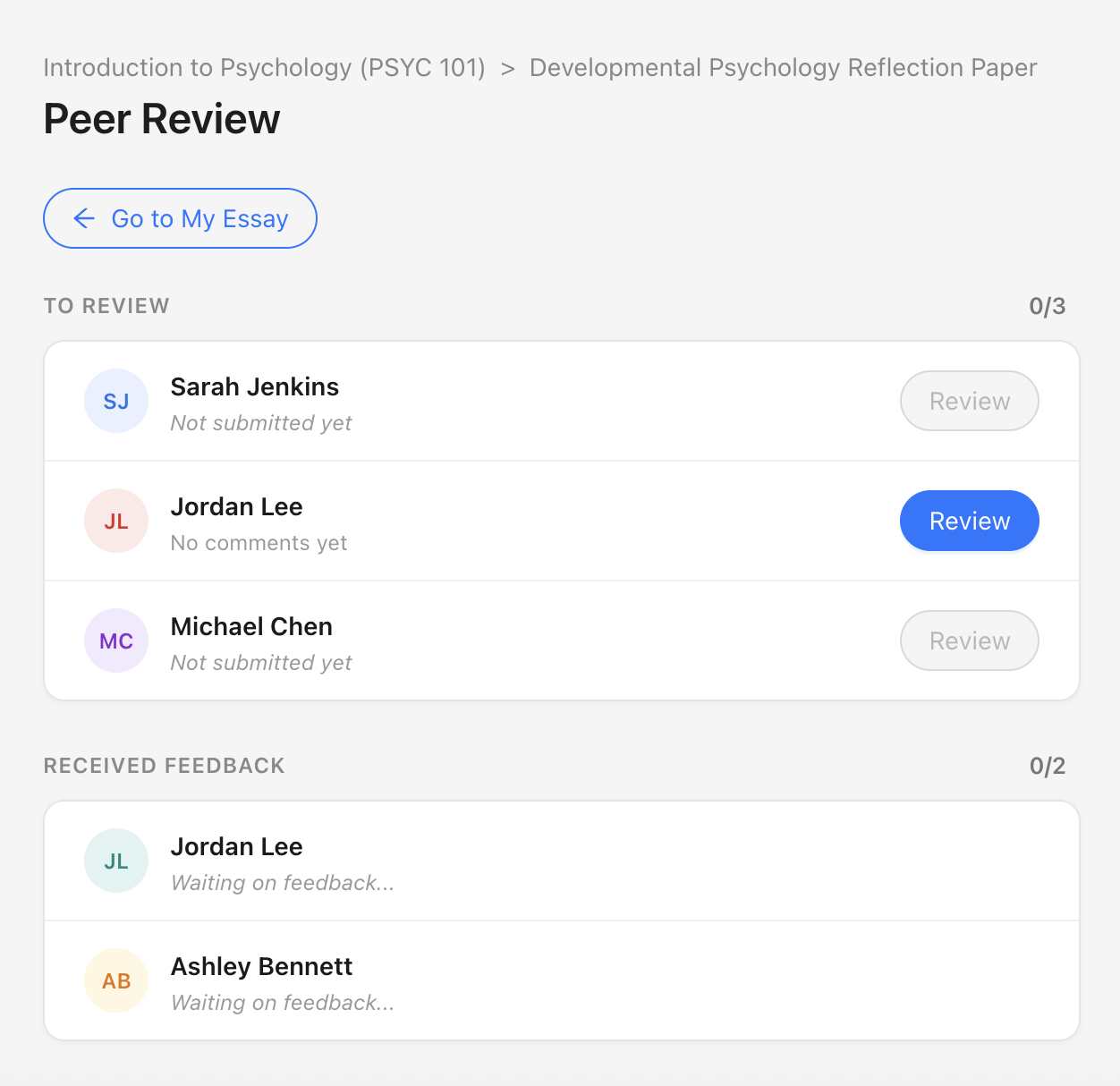 Clicking it gives them access to their assigned peers' essays, where they can highlight sections and leave comments. The experience mirrors commenting on their own work, making the process familiar and intuitive.