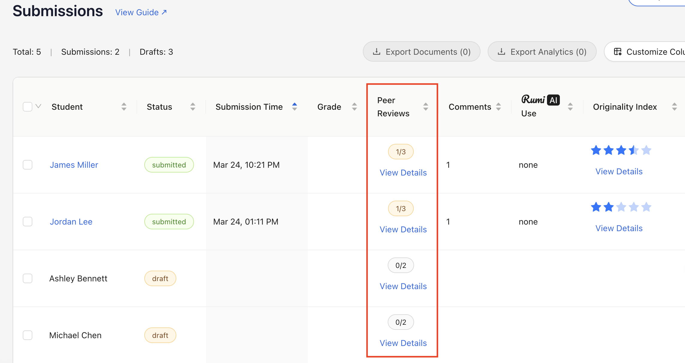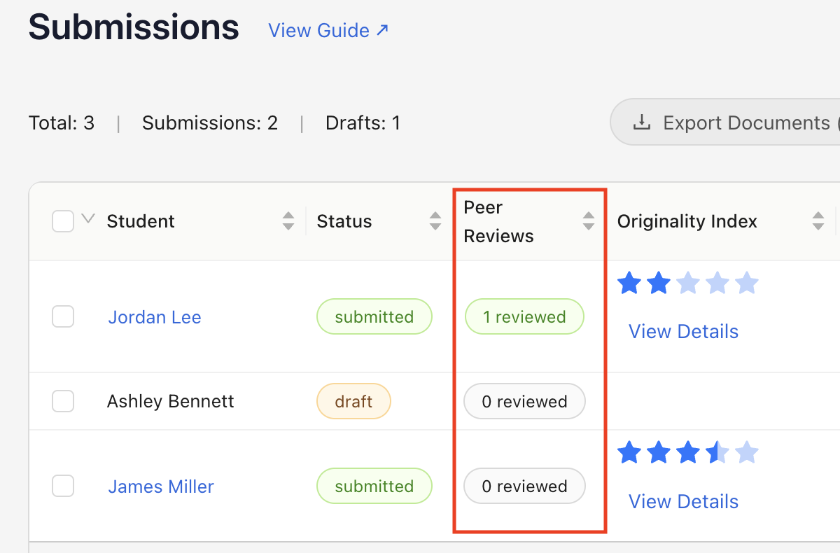 Instructors can monitor all review activity from the Submissions Dashboard.